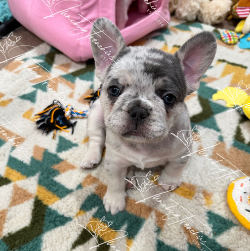 Meatball's structure is phenomenal, he has a big head, wide chest and short legs. He's the most handsome boy with his beautiful blue merle pattern and creamy tan points. Meatball is cutest little ball of happiness and makes everyone smile.